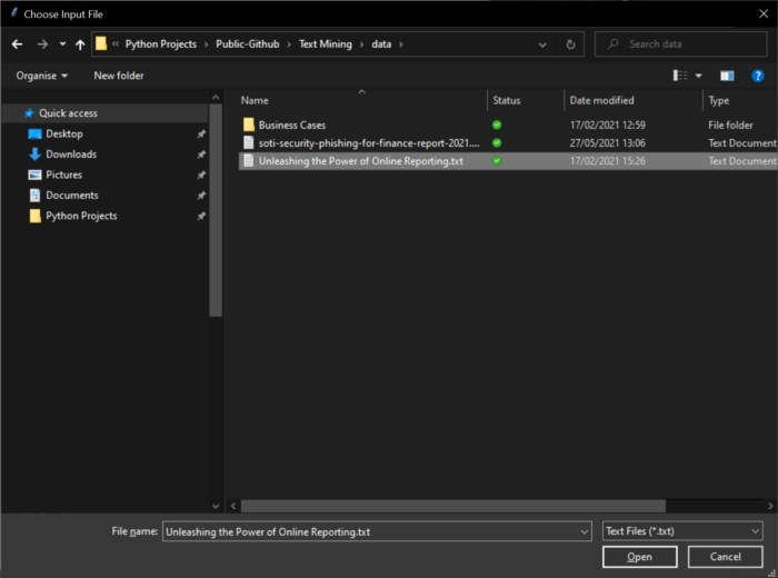 The building blocks for our text summarization utility handle the leg-work of allowing the user to browse the local file system to select a file to summarize.